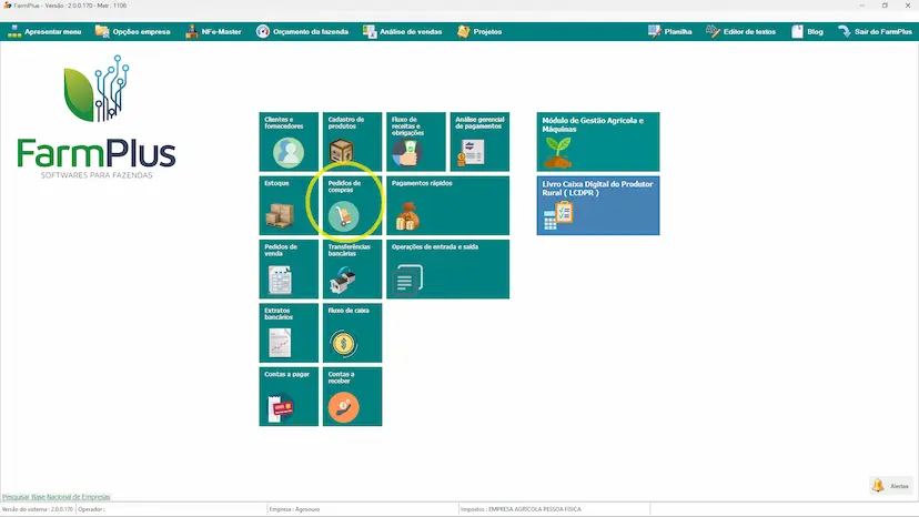 A imagem abaixo mostra como acessar os Pedidos de Compra a partir da tela inicial do FarmPlus :