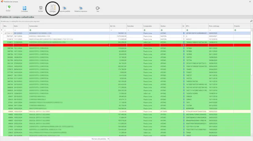 A imagem abaixo mostra um exemplo de como a relação de Pedidos de Compra é apresentada. Entre as opções do menu existente nesta tela, a opção Entregas fornece um balanço para cada produto das quantidades entregues e pendências por parte de cada fornecedor para todos os produtos constantes nos pedidos.
