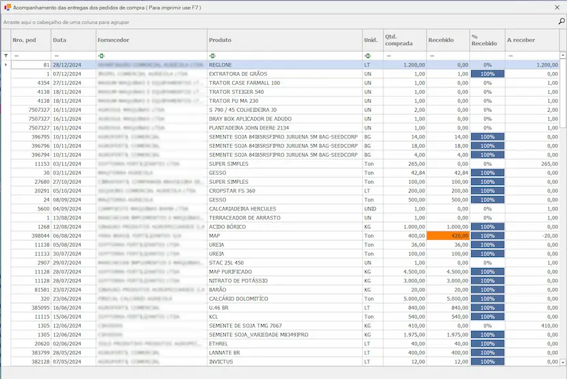 A tela abaixo apresenta para cada produto informado nos pedidos, o número do pedido de compra, a data do pedido, o fornecedor, o produto, a quantidade comprada, a quantidade entregue, o percentual da entrega e a quantidade a receber.